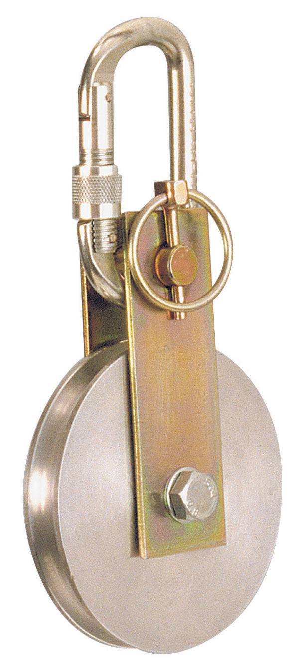 Pulley with self closing/locking carabiner fits up to 13 mm (1/2″) lifelines.