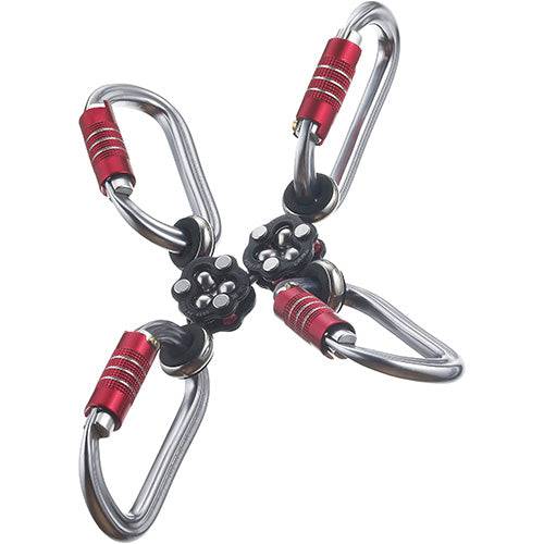 • A revolutionary 3D swiveling rigging plate equipped with 4 connection points that rotate independently to allow them to be self-orienting even in the most complex rigging scenarios.