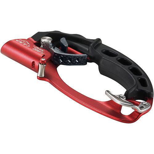 The Turbohand Pro ascender is the absolute top of the line for maximizing efficiency while ascending ropes. It features a proprietary roller. Which not only helps with climbing efficiency by making the upward glide much smoother, it also reduces dangerous wear and tear on the device where the rope tends to rub on the body of a traditional ascender. The removable rope guide at the bottom of the handle optimally aligns the rope for long ascents. The ergonomic rubber handle extends into the upper part of the spine to allow for a double-handed grip. The handle and the rope are aligned on the same plane for the best handling and efficiency. Features three large attachment points, two on the bottom and one at the top, for optimal organization. The stainless steel rope guide reinforces the main attachment point for increased resistance to wear and tear. It also prevents the carabiner from interfering with the rope. The robust body is constructed from 3.5 mm aluminum alloy. The geometry is verified for use on traverses. The toothed cam is finished with a special anti-wear treatment and features drain holes to help prevent the build up of mud and grit. The opening system is protected on both sides to prevent accidental openings. The proprietary roller also allows the Turbohand to be rigged as a locking pulley for light hauling with a max load of 50 kg, 110 lbs. NOTE: This configuration is not intended for hauling or securing of bodies.