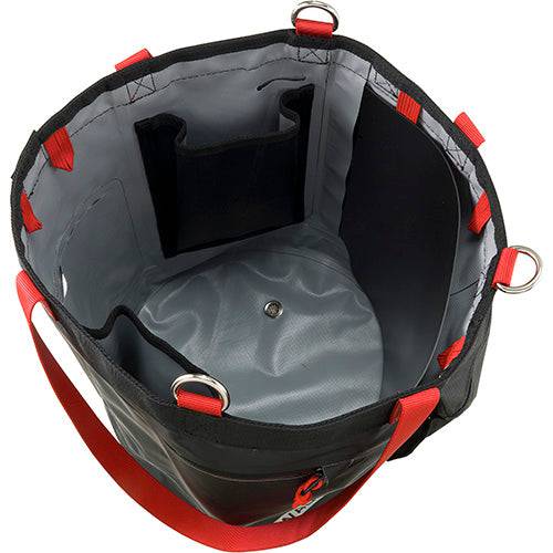 Bucket bag for carrying and hauling tools. Constructed from robust Tarpaulin PVC 500D with high-frequency welding. Three metal rings are designed for clipping to a harness or suspending from a rope or structure. Semi-rigid construction keeps the bucket open during use. Closure hood stows away in a pocket when not in use. Wide interior pockets for extra organization. Interior gear loops are designed to be used with Spacecraft Bags (sold separately). Transparent label pocket.