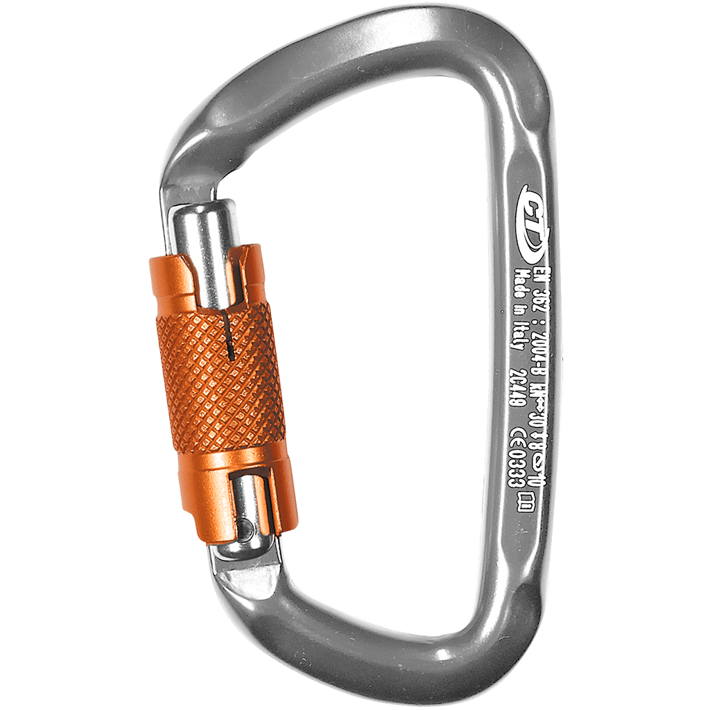 D-shape light alloy connector with twist-lock gate, ideal to be used as a terminal connection for lanyards or to set up a belay.