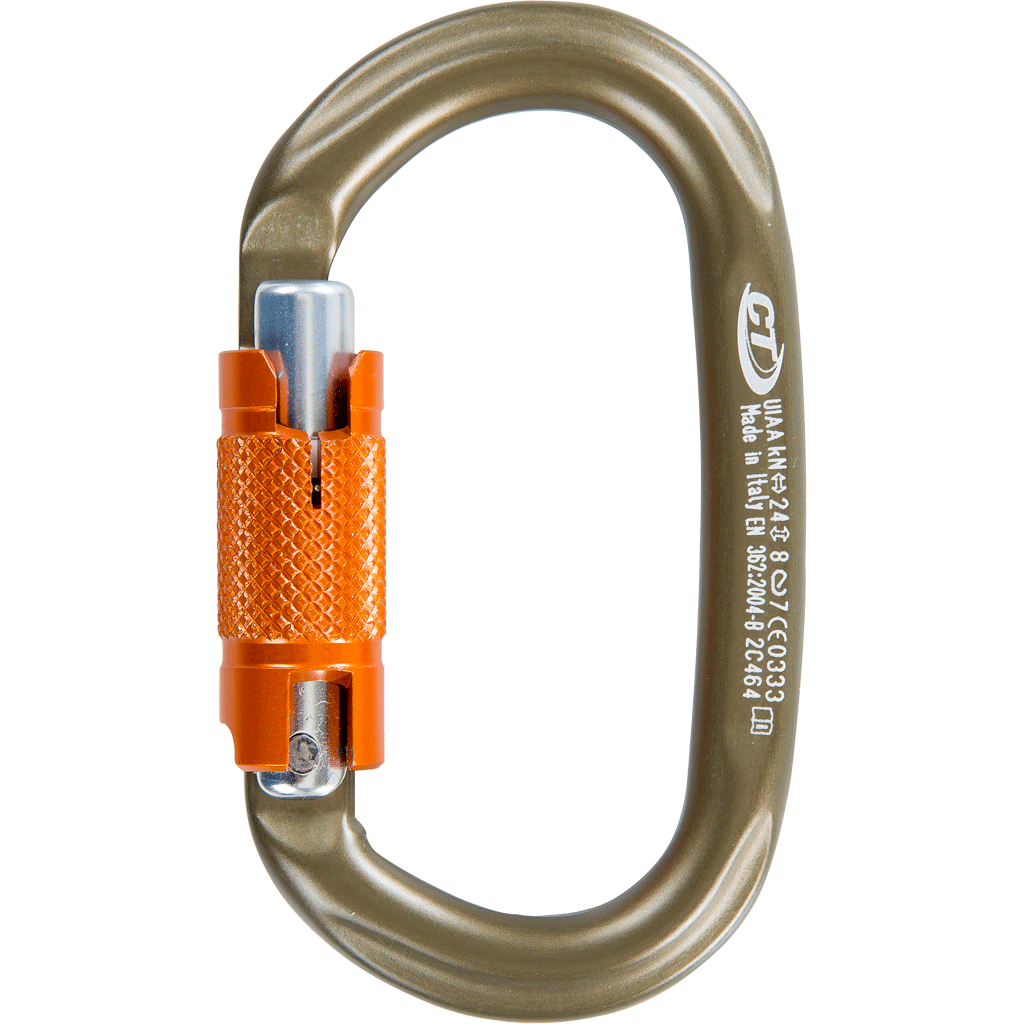 Light alloy oval-shaped carabiner with twist-lock gate, designed for mountaineering, aid climb, big wall, speleology, and rescue operations.