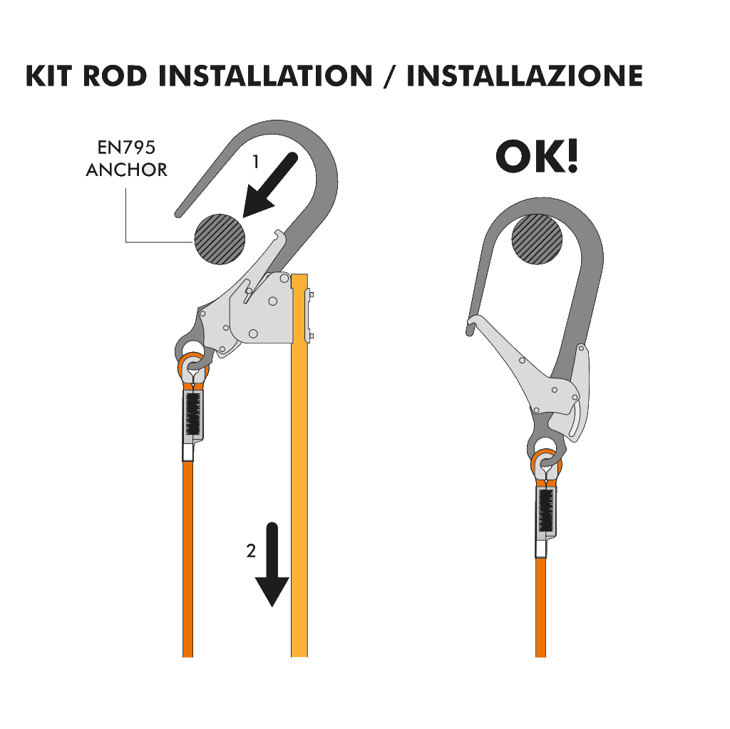 - The connector of the lifeline is inserted into the mounting and the mechanism keeps the lever open, releasing it when the connector is in position