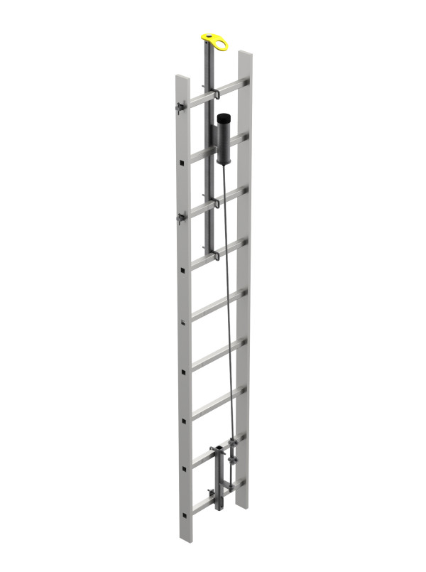 The Lad-Saf™ flexible cable system consists of a top and bottom bracket that act as anchors for a steel cable that runs the length of the climbing area. This version of the system has been specifically designed for Wind Towers. All the components required for installation are included in the kit with the exception of the traveller. Kits are available in a variety of lengths. The top bracket of this special wind version includes a D-ring anchor that rotates so that the user can safely transfer from the top of the system to a platform.