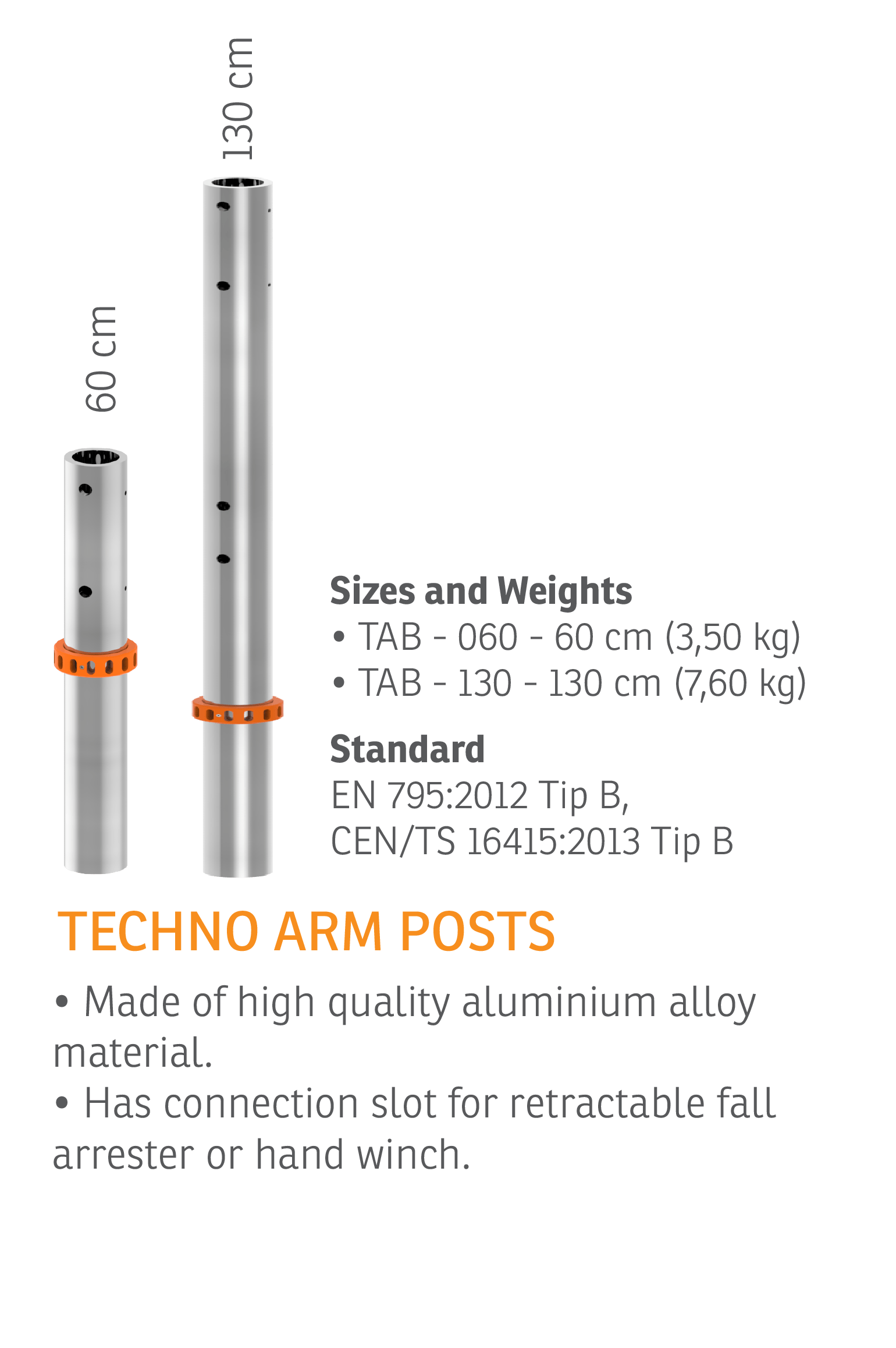 Designed to be used as a fall arrest and rescue system when working in manholes, platforms, silos, roof edges etc. Made of aluminum alloy material, it is lightweight. Transportation and installation can be performed by one person. It has 360-degree a rotatable console body. Can be fixed when requested. The console posts have two different sizes (60 and 130 cm) for different working heights. The cantilever can be adjusted in eight different positions in accordance with the required angle, position and height. Switching in positions is easily accomplished by changing the pin position. It has more than one ground sleeve for different working areas. Retractable Fall Arrester with Recovery Arm and / or Hand Winch can be mounted on anchorage body. Certified with 3 independent anchor points with a 100 Kg dynamic load. Maximum SWL is 300 Kg for static loads.