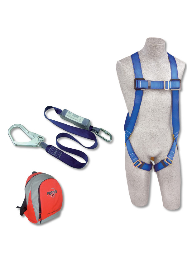 Kit comprising harness & shock absorbing lanyard and back pack for storing items.