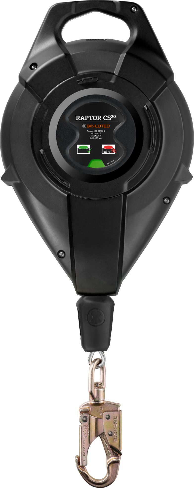 The RAPTOR CS retractable type fall arrester with self-retracting stainless steel rope and automatic blocking function allows safe working at height and depth.